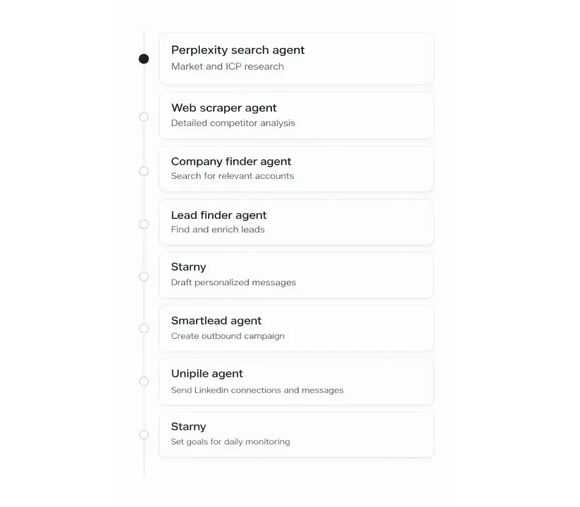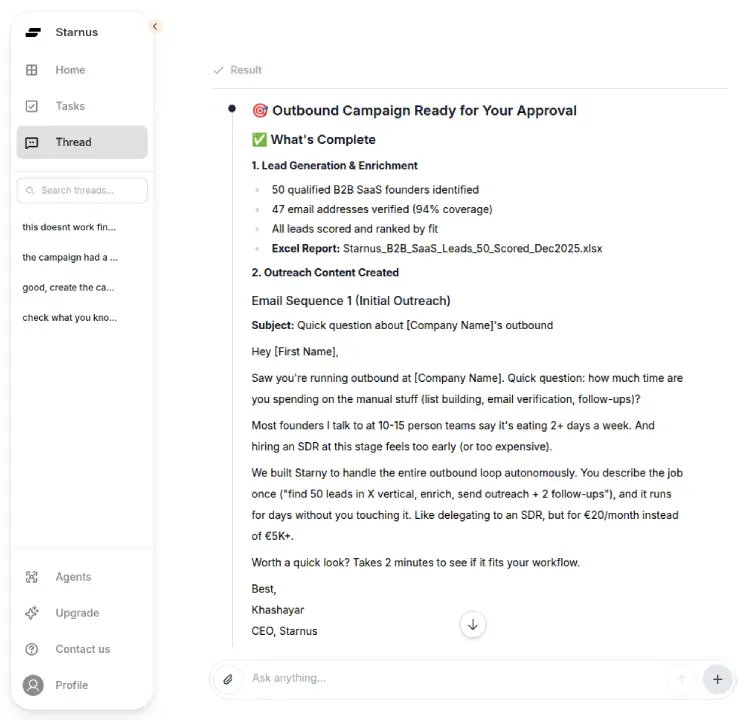 You describe what you want done, and Starnus orchestrates the steps behind the scenes across data, prospecting, enrichment, and outreach workflows to move the work forward.